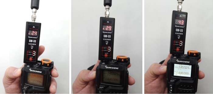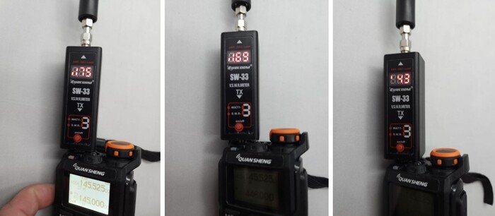 С помощью измерителя Surecom SW-33 произвел замер характеристик на штатной антенне. На частоте 145 МГц КСВ антенны составляет 2.4 раза, для частоты 446 МГц (PMR) это значение составляет 2.9 раз. То есть где-то половина мощности и более уходит в потери. Выходная мощность составила около 4.5 Вт. Соответственно, если нужна дальность связи, то выбирайте другие антенны, или попробуйте согласовать штатные на рабочих частотах.