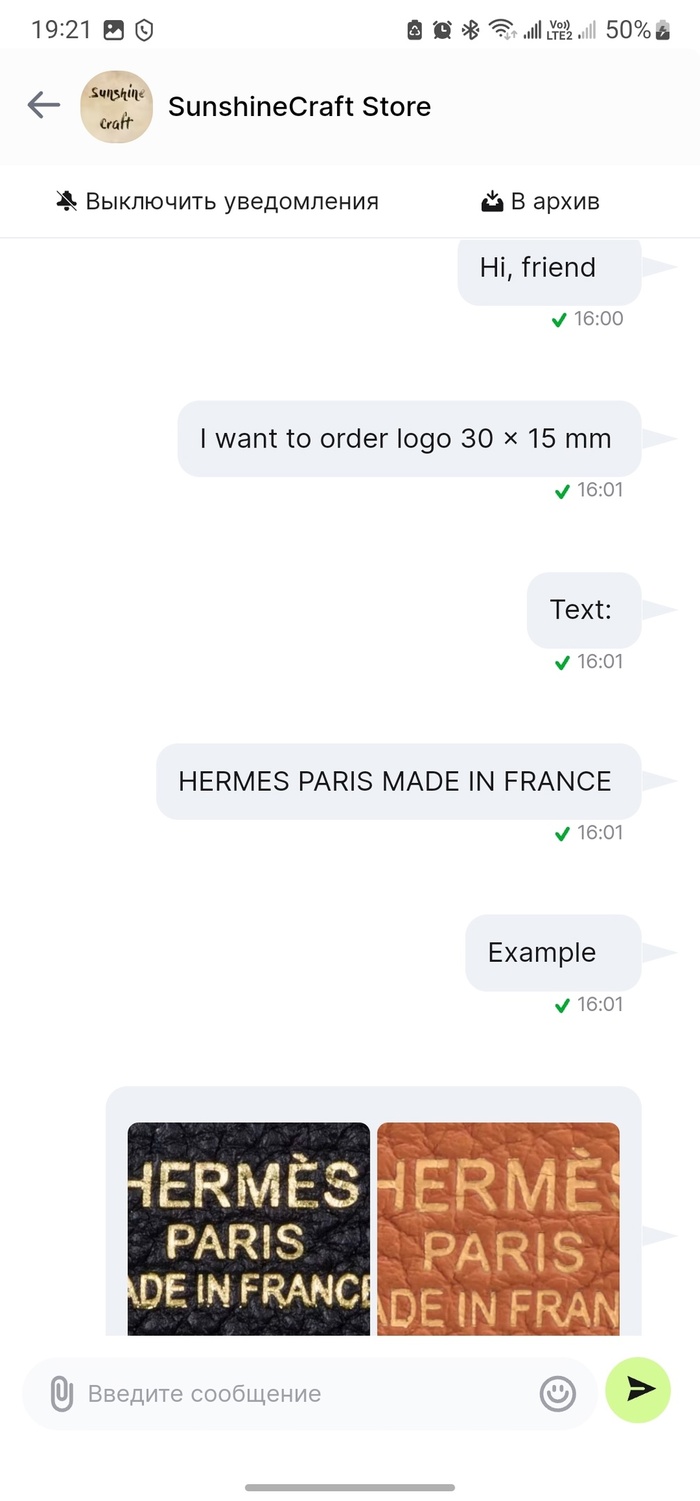 Недорогой вариант и один из самых простых в реализации — это штампы/клише для горячего тиснения. Изготавливаются из латуни, имеют резьбу для установки на нагреватель или держатель. Подойдут для нанесения логотипа или информации на дерево/фанеру, будут полезны в кожевенном ремесле и даже для кастомизации продуктов выпечки. Если у вас просто текст — достаточно выбрать формат (выбрать в лоте размер Х на Y сантиметров при оформлении) и написать продавцу свои пожелания. На Алиэкспресс редко бывает высокий честный рейтинг на товары. Но в данном случае пользователи делятся своим реальным опытом заказа латунных клише — вы можете найти примеры в отзывах по ссылке. Скажу честно — нашел и заказал сам. Процесс общения с продавцом и результат - прикрепляю. Ничего в этом сложного нет. Оценил экономию раза в три - у нас такое стоит на 2-3 тысячи дороже.