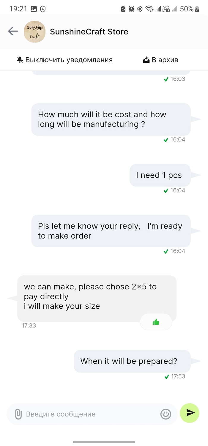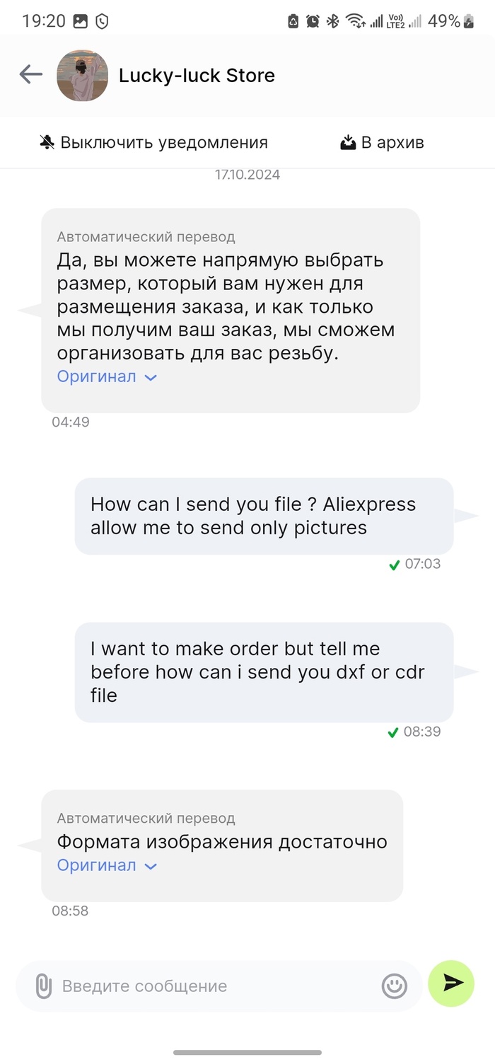 Именно размах производства и отработанные процессы, а также логистика за счет самого маркетплейса Алиэкспресс дают возможность сделать приемлемые цены за, казалось бы, дорогостоящие услуги. Самое простое, что приходит в голову — это фрезеровка, лазерная резка, 3D печать металлами и изготовление кастомных вещей. Именно по вашим требованиям, размерам и чертежам. Сам по себе процесс заказа достаточно простой. Добавляете выбранный лот по ссылке в корзину и пишете продавцу. Я стараюсь показать скриншот, фотографию чертежа или изделия, которое я хочу получить. Продавец оценивает и говорит, сколько будет стоить (какой вариант в лоте выбирать для оформления) и сколько ждать изготовления. Оформляете заказ привычным способом и оплачиваете. Обратите внимание, прикрепить файлы 2D или 3D чертежей в сообщениях на Алиэкспресс не получится. Для этого нужно будет пересылать продавцу на почту или же переводить чертежи в формат изображения. Итак, 7 сервисов по изготовлению на Алиэкспресс — начну с самого простого.