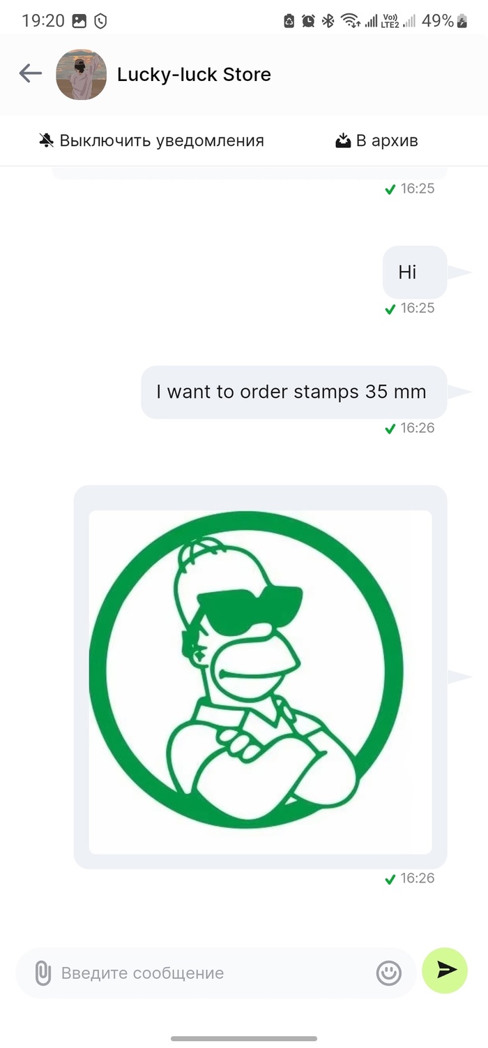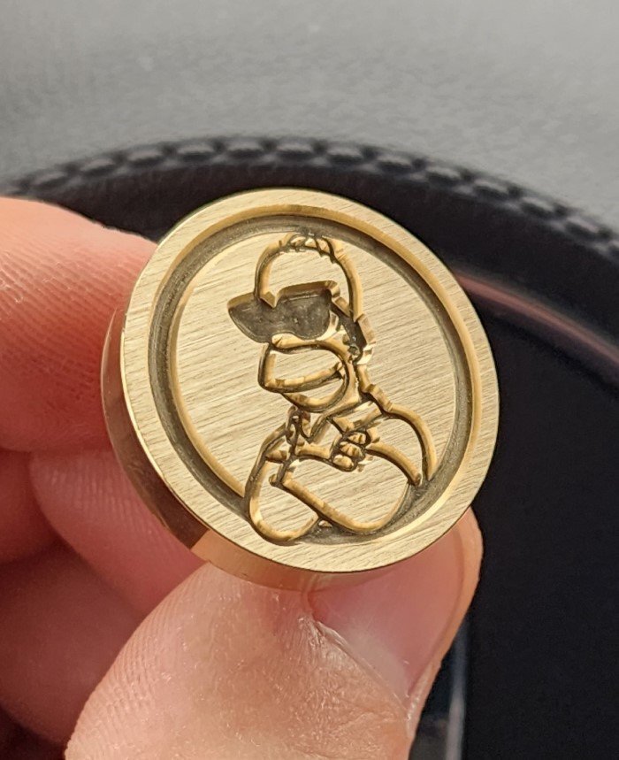 То же самое, что и предыдущие клише, но круглой формы. Изготавливаются из прутка, так что первоначально определяйте необходимый диаметр. Материал — латунь, имеют резьбу для установки на ручку. Такие штампы подойдут для скрапбукинга или для сургучных печатей. Например. Если вы планируете сделать оригинальное поздравление или авторский квест, то хорошая идея сделать подобный персонифицированный штамп. Аналогично предыдущей услуге, заказал изготовление данного штампа с изображением Гомера Симпсона. Процесс общения с продавцом и результат - прикрепляю.