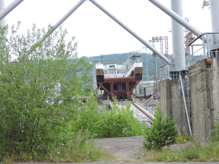 На круге "ковш" переходит на другую колею и опускается вместе с судном в Енисей уже выше плотины.