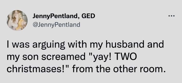 104 Wildwildworld Twitter Оптимист 11 месяцев назад Я ругалась с мужем, а мой сын из другой комнаты закричал: «Ура! ДВА Рождества!» Скриншот X (Twitter) 3 1 1 1 Ещё 0