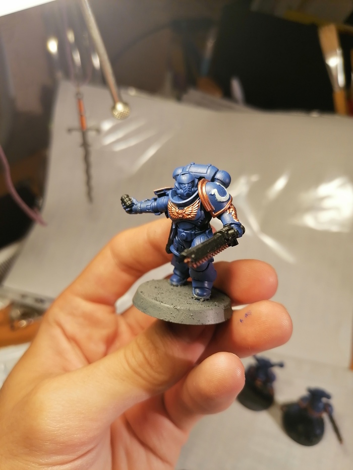 Решил собрать для начала отряд Ультрамаринов. Потому что относительно просто и потому что они суп варят. Взял стартовый набор для покраса с тремя миньками и трёх отдельных челов. Да, тут игра, найди импосторов, эти чёртовы карланы-хаоситы решили побывать ультрамарами. Ради фана)