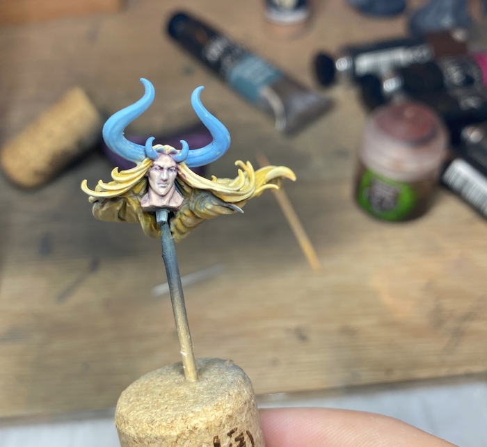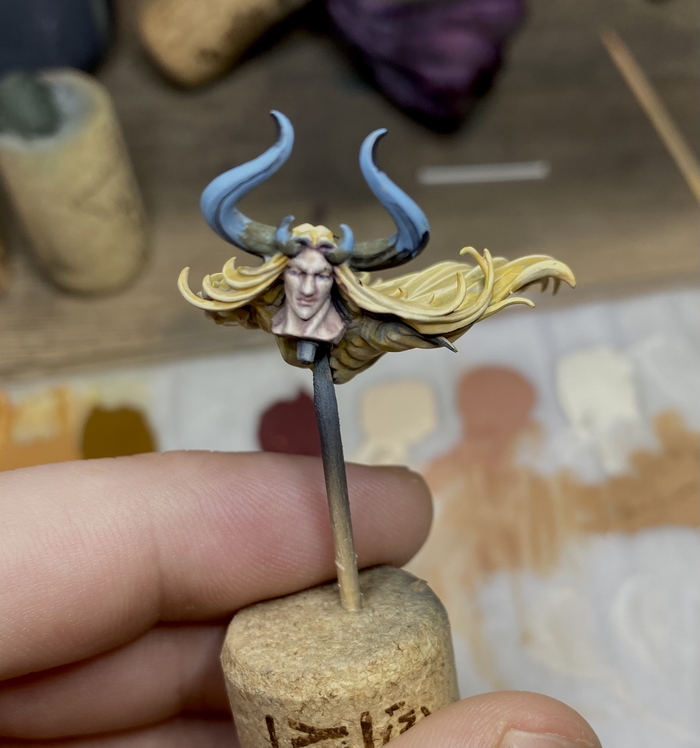 Следующим шагом делал глаза. Увлёкся и не сделал фото. Глаза делал по такому принципу: светло-голубой практически в белый цвет залил в глаза аккуратно тонкой кистью и дал высохнуть, после темно синим сделал две полоски ближе к переносице, в этот момент 150% шанса заляпать все вокруг и это нормально. После, нижнюю часть глаза корректируем светло-голубым и веки базой кожи.