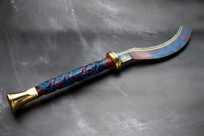 Для рукояти я использовал акриловый брусок, который идеально сочетает все цвета этих хаоситов, плюс латунная гарда и больстер, чтобы повторить максимально дизайн первоисточника.