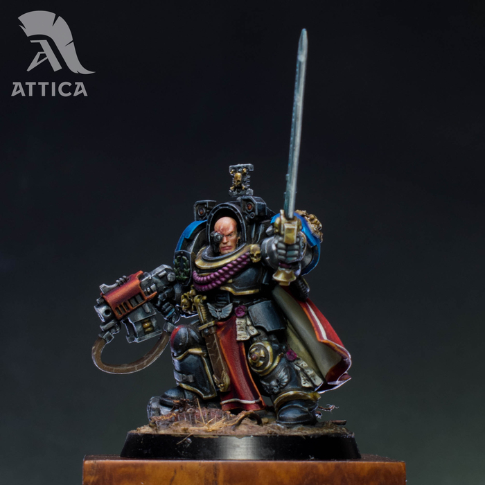 Это Галлан Оптимар единственный выживший терминатор из экспедиции дес вотча на пустотный левиафан тиранидов, в память об этом, он окрасил череп на левой перчатке