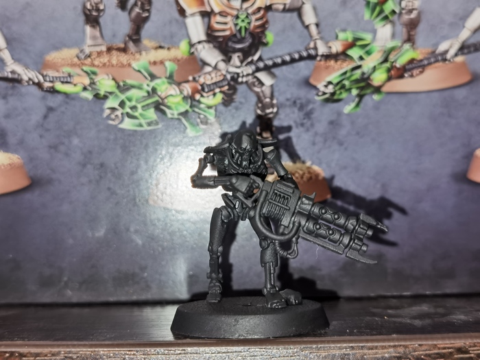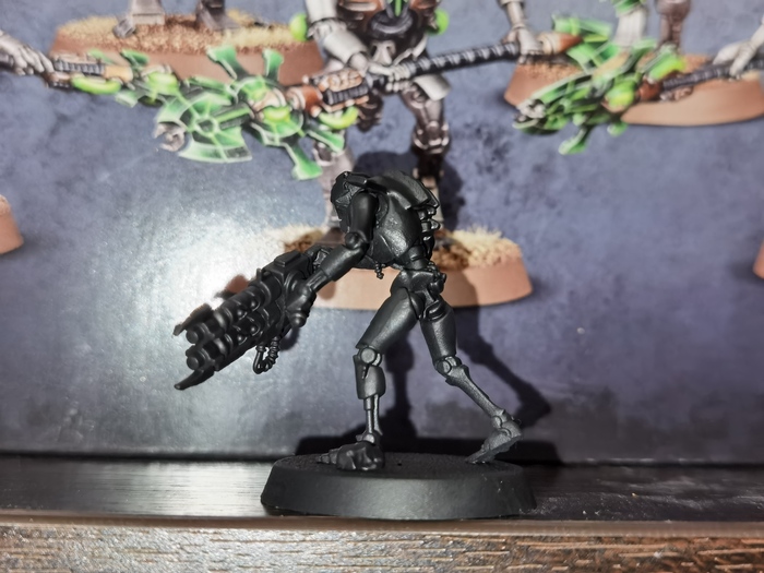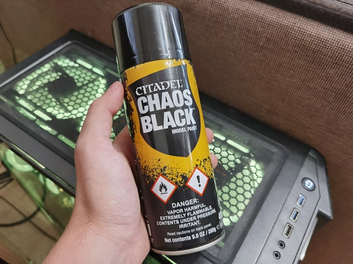 Ну и, раз уж швы заделаны - миньку, теперь, можно и загрунтовать. Для грунтовки я использую краску-спрей Chaos Black от Citadel.