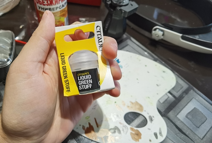 Для того чтобы их убрать, я приобрел себе Liquid Green Stuff от GW (в простонародии - зеленка), или шпатлевка, которая нужна, чтобы как раз таки эти швы убрать.
