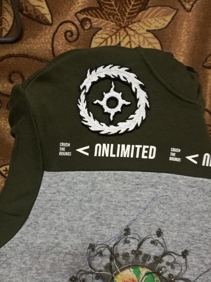 Затем проблема встала в выборе цвета, сначало конечно хотелось каноничного золотого и синего, но цвет кофты не сочетался никоим образом с подобной гаммой и решено было выбрать просто белый цвет. Получилось нечто подобное, творца данный результат не устроил и все было решено переделать. (Отдаю ей должное, упрямство и усидчивости подруге не занимать. Человек пока шил послушал про Империум, Богов Хаоса и различные культы, можно сказать в легионе вахоебов прибыло)