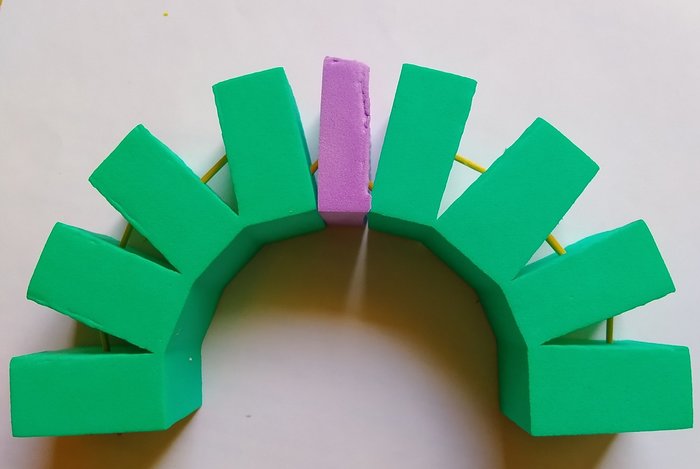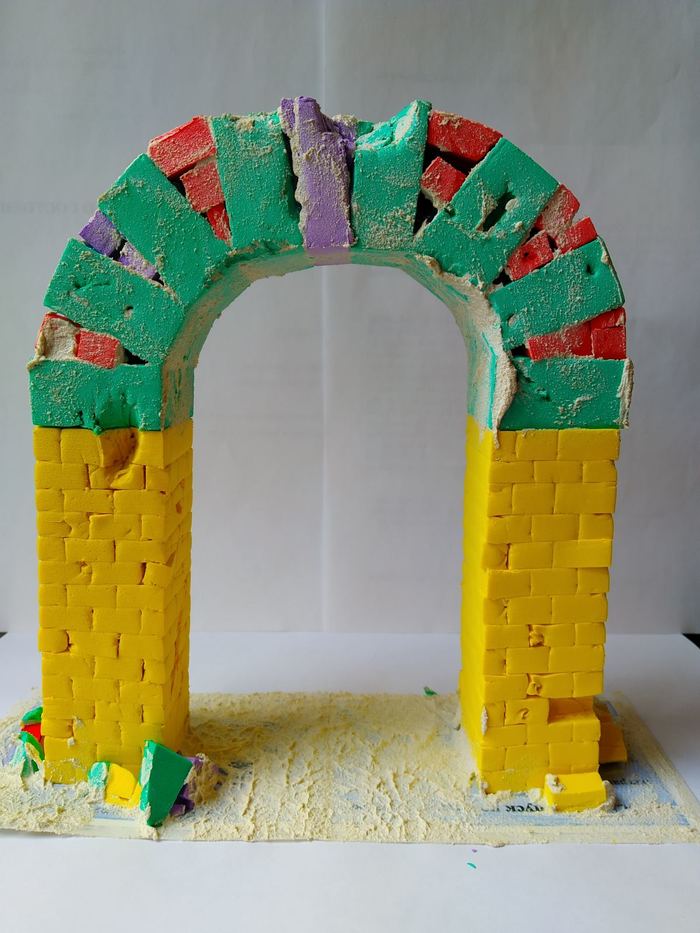 Потом переходим к изготовлению арки. Блоки средней величины прорезаем не до конца, вставляем зубочистки(чтоб блоки не теряли форму), внутри проклеиваем. Добавляем и приклеиваем в щели, обрезки из других деталей конструктора