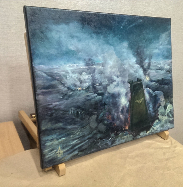 Война на планете Джумаль IV напоминает затяжные окопные противостояния Первой Мировой Войны, картина как раз запечатлевает момент приземления посадочного модуля на нейтральной территории под перекрестным огнем двух армий.