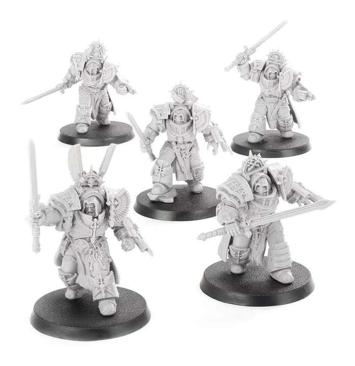 В набор входят 41 смоляная деталь и 5 круглых подставок 40мм, с помощью которых можно собрать 5 Рыцарей Внутреннего Круга Легиона Тёмных Ангелов.