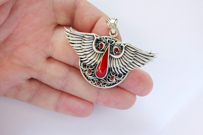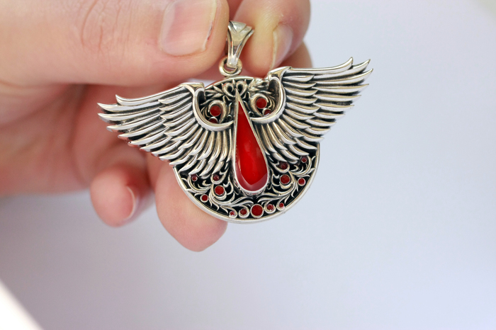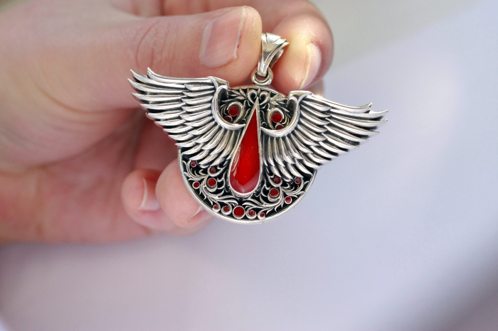 Здравствуйте . Всех с Наступающими . Появилось Время что бы выложить фото кулона Кровавых Ангелов 4 версии . Материал Серебро 925 пробы и Красная Эмаль . Вес примерно 46 грамм . Размер 35 мм x 65мм .