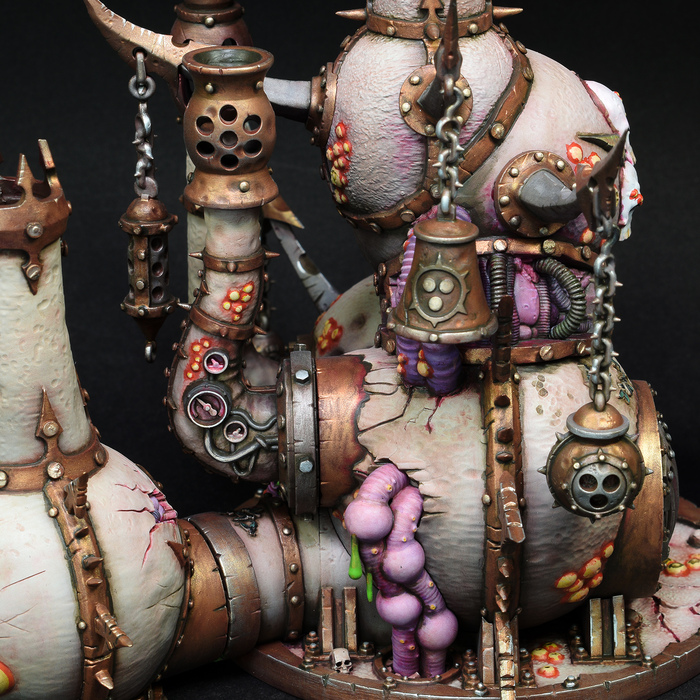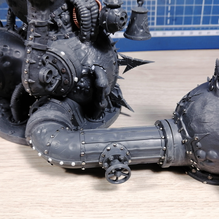 Не так давно вышедший набор от Games Workshop. Практически все заклепки заменил на металл (булавки и гвозди), около 300+ шт. Базовая окраска аэрографом акрилом Тамия, роспись кистью Валехо и Звезда. Тонировка худ.маслом. Соединительная труба на магнитах. Высота модели около 20см. P.S. Довольно необычный и неожиданный проект для меня, захотелось ярких цветов и необычных форм.