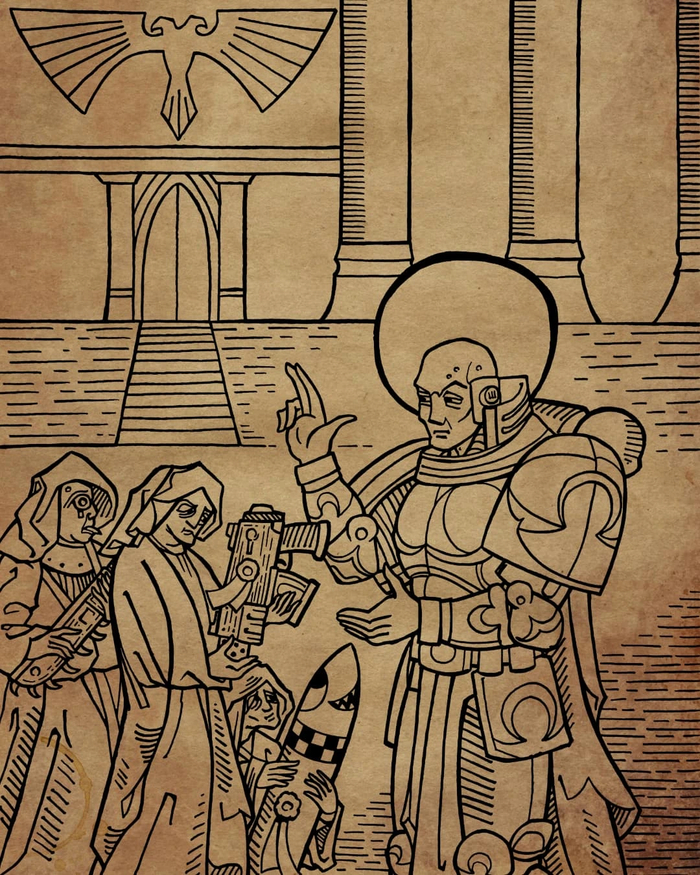 Под бронёй она была облучённым пехотинцем Машинного бога. Её кожа, тёмно-коричневая от рождения и ничем не отличающаяся от кожи Энварика, посерела от голода и отсутствия солнца. Её ритуально лишили конечностей, заменив руками и ногами недорогой кибернетической чистоты. К её чести, служительница Омниссии достигла такой благодати в мехаморфозе, что теперь доля святого железа в её теле превосходила остатки несовершенной плоти.