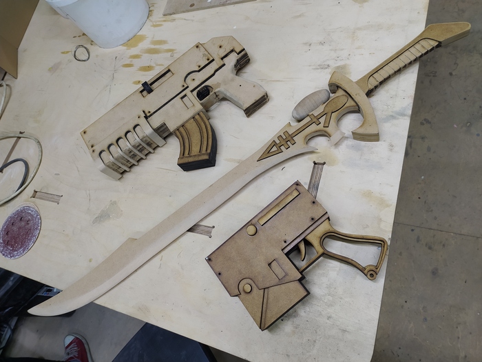 В программе Corel draw создал чертёж-выкрйлку, изменил пропорции под человеческие, в качестве рукоятки взял Desert eagle. Склеил, обработал напильниками и наждачкой. Загрунтовал. Покрасил в черный, затем часть покрасил в цвет "gunmetal" а часть в красный с баллончиков.