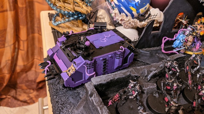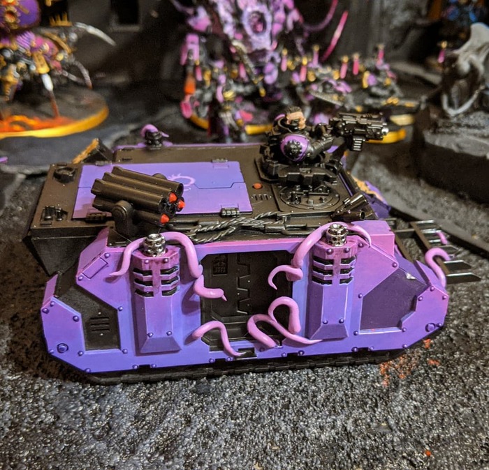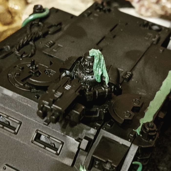 Рино ни хаоситскую, ни лояльную в продаже я не нашёл, так что пришлось брать Razorback и немного дорабатывать напильником: распечатать и присобачить havoc launcher, которого нет в комплекте, убрать орудие, которого, к сожалению, у хаоситов нет. Так получилась рина. А вот чтобы она стала слаанешитской, пришлось доставать зелёнку: