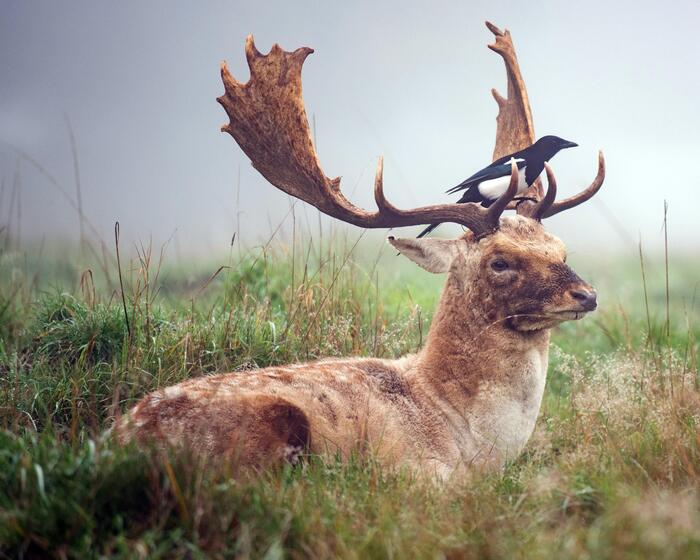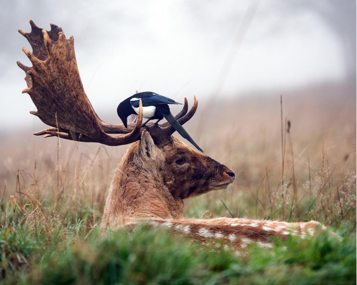 Великобритания, Лондон. Фотограф Макс Эллис во время прогулки по Ричмонд-парку увидел сороку, сидевшую на раскидистых рогах оленя. Казалось, что птица подсказывает ему дорогу, но на самом деле проворную сороку привлекли клочки шерсти, свисающие со шкуры линяющего оленя, — это прекрасный строительный материал для гнезда.
