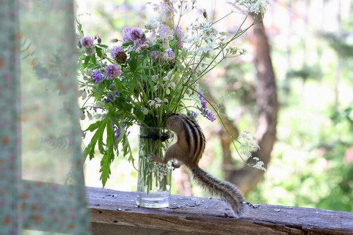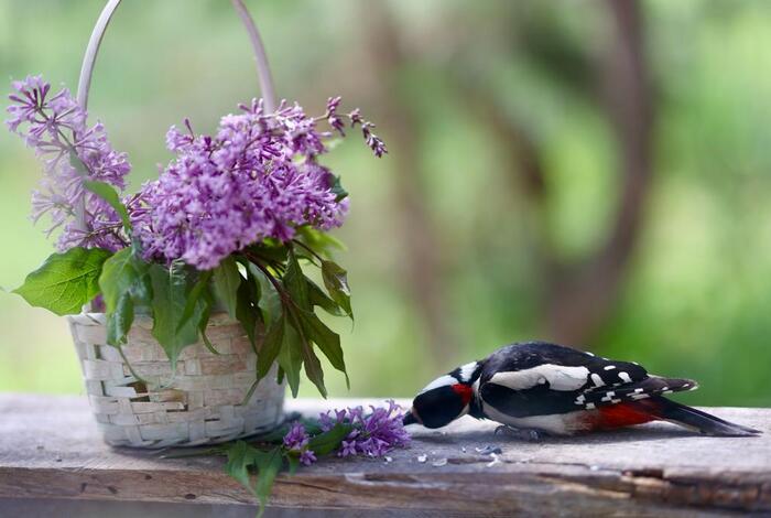 С отцом восстановили старый почти заброшенный с 90-х дом в деревне, и там у нее появилась стационарная экспозиция для съемок местных животных и птиц. Сперва это были синички и воробьи, потом пришел бурундук и привел всю свою родню, а сейчас вот и дятлы подтянулись ))