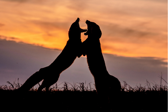 Фотограф-натуралист Анна Стелло запечатлела поединок двух подрастающих лисят. Они решили помериться силой в лучах закатного солнца.