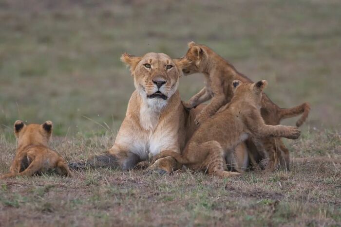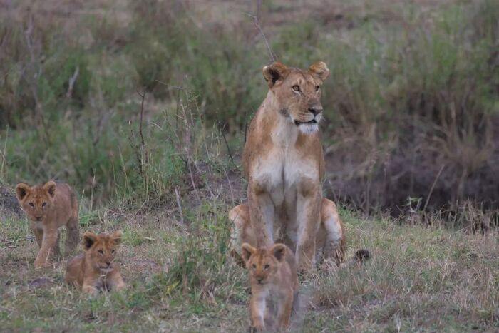 Пятнистые гиены разбегаются при виде шествующей львиной пары.