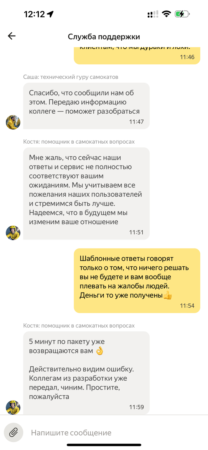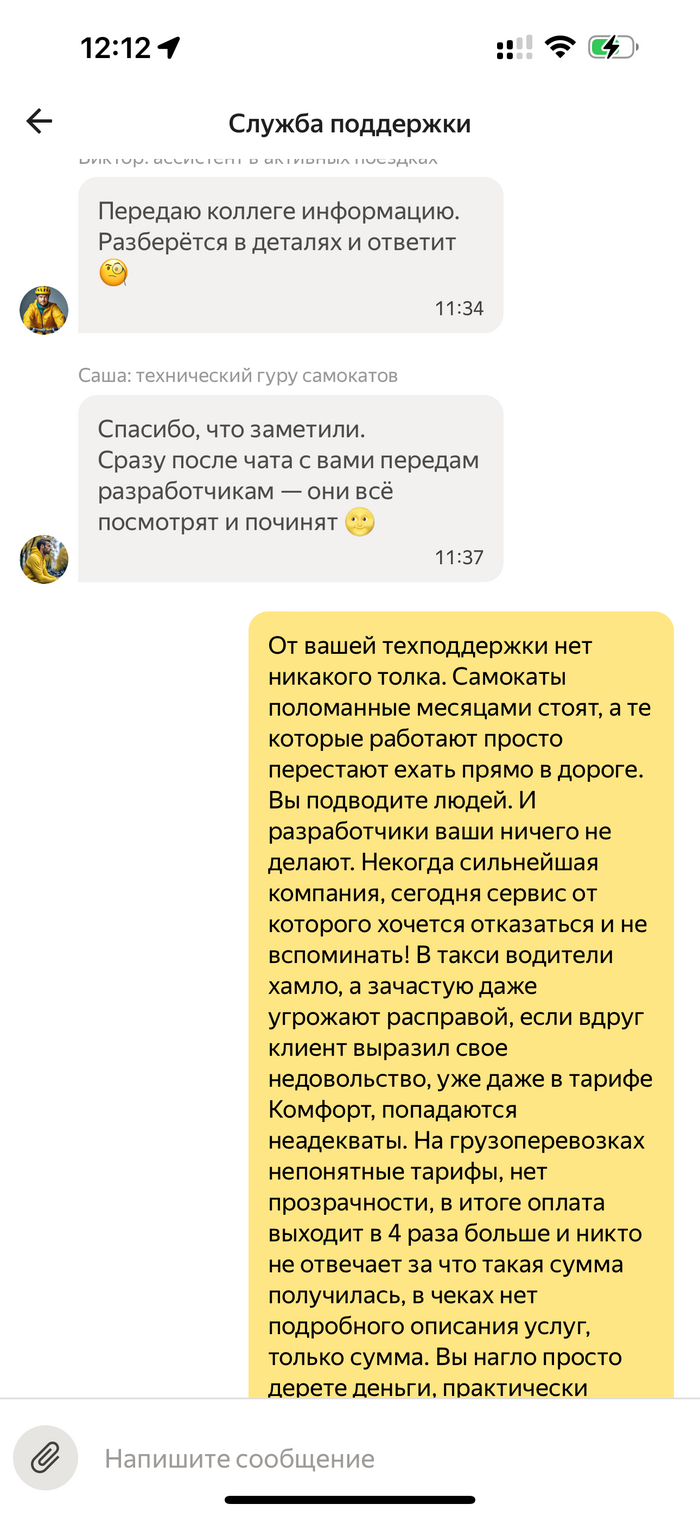От Яндекс техподдержки нет никакого толка. Самокаты поломанные месяцами стоят, и сколько бы мы не писали их не убирают и не меняют. В приложении их видно, как доступные. Бронируешь, идешь до него минут 5-7, подходишь, оказывается воспользоваться не можешь, пока покрутишься возле него итого 10 минут потеряны. Потом идешь еще до какого-нибудь ближайшего самоката, еще минут 10 теряешь. Иногда по утрам перед работой доходит до того, что иду пешком в итоге или только 3ьим или 4ым самокатом могу воспользоваться🤦♀️. Эта проблема уже больше месяца в районе Кузьминки. А те самокаты, которые работают просто перестают ехать прямо в процессе езды. Так же проблеме примерно месяц, сегодня уже третий случай. Яндекс подводит людей. И разработчики ничего не делают. Некогда сильнейшая компания, сегодня сервис от которого хочется отказаться и не вспоминать! В такси водители хамло, не дай Бог поехать на экономе, частые случаи, когда угрожают расправой, если вдруг клиент выразил свое недовольство, уже даже в тарифе Комфорт и +, попадаются неадекваты. Это не только моя история. С этим Яндекс так же ничего не делает уже более 3х лет. На грузоперевозках непонятные тарифы, нет прозрачности, в итоге оплата выходит в 4 раза больше и никто не отвечает за что такая сумма получилась, в чеках нет подробного описания услуг, только сумма. Продукты в лавке, мягко говоря некачественные, фрукты и овощи просто незрелые привозят👍