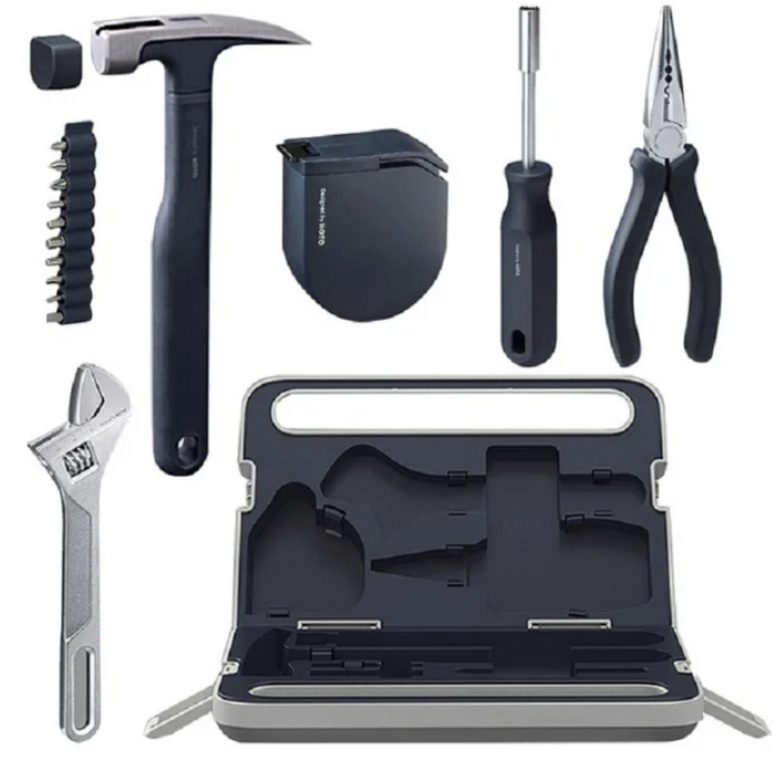 Первый набор включает молоток с магнитным держателем для гвоздей, разводной гаечный ключ, плоскогубцы, рулетку, отвертку и набор бит.
