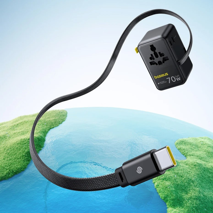 Многофункциональный переходник для розеток разных стран. Оснащён USB и Type-C портами, мощный (до 70 Вт), достаточно прочный для поездок.