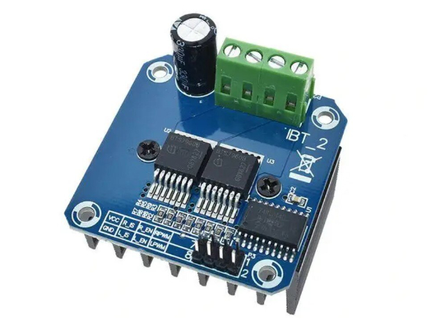 Этот высокотоковый драйвер управляет коллекторными моторами постоянного тока с высокой точностью и надёжностью. Основу устройства составляет Н-мост, реализованный на мощных микросхемах BTS7960, каждая из которых оснащена собственными цепями защиты от перегрева, перенапряжения и короткого замыкания. Благодаря этому драйвер способен выдерживать значительные токи, сохраняя стабильную работу в длительном режиме.