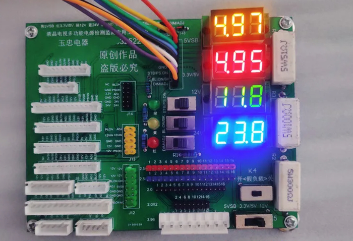 Профессиональное устройство для диагностики и ремонта источников питания телевизоров и другой электроники. Эта плата оснащена цифровыми индикаторами, отображающими значения ключевых напряжений (5V, 12V, 24V и др.) в реальном времени, что позволяет мгновенно оценивать работоспособность схемы.