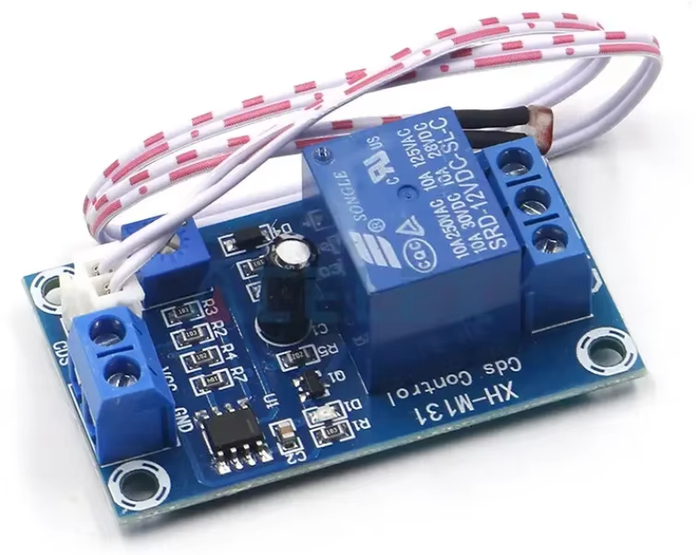 Это устройство управляет подачей питания в зависимости от уровня освещения и подходит для автоматического включения света при наступлении темноты. Выносной датчик, подключаемый к основной плате, делает установку более гибкой — его можно разместить в наиболее подходящем месте, не привязываясь к положению самого реле.