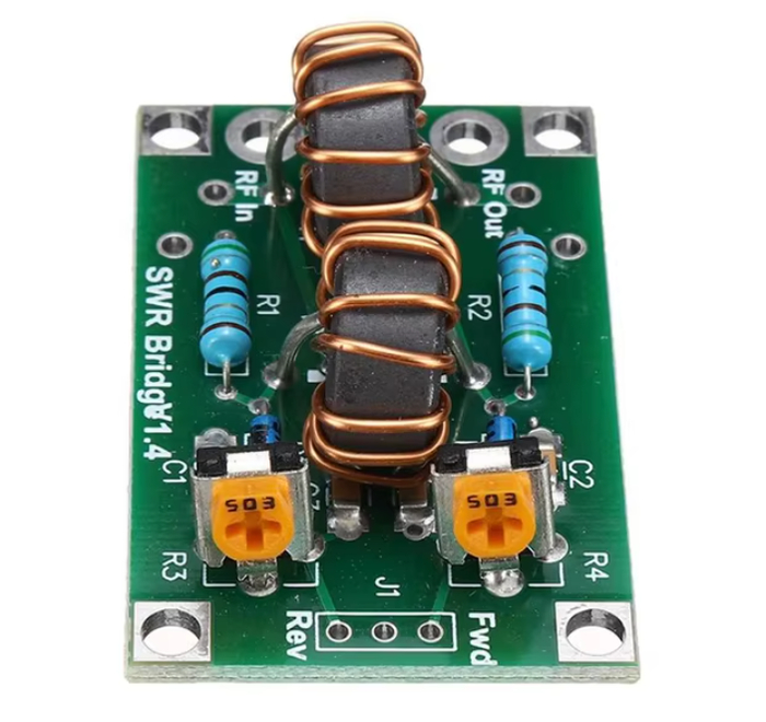 Этот модуль представляет собой радиочастотный мост для измерения коэффициента стоячей волны (КСВ, англ. SWR — Standing Wave Ratio), широко применяемый в радиотехнике и антенностроении. Основанный на простейшей схеме с ферритовыми трансформаторами и согласующими элементами, он позволяет точно определить уровень отражённой мощности и оценить качество согласования антенны с передатчиком.