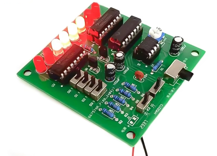 Этот компактный набор — отличный способ познакомиться с принципами счёта, деления частоты и управления светодиодами. В основе схемы лежит микросхема CD4017 — декадный счётчик с десятью выходами, каждый из которых поочерёдно активируется при поступлении сигнала. В данном случае таким сигналом служит звук, улавливаемый микрофоном.
