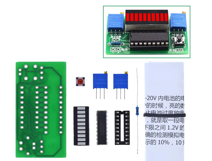 Этот модуль — отличное решение для визуального отображения уровня заряда батарей в диапазоне от 2.4 до 20 В. В его основе лежит микросхема LM3914, которая уже более 20 лет используется для построения простых и надёжных аналоговых индикаторов. Она управляет 10 светодиодами, отображающими уровень напряжения — чем выше заряд, тем больше светится диодов.