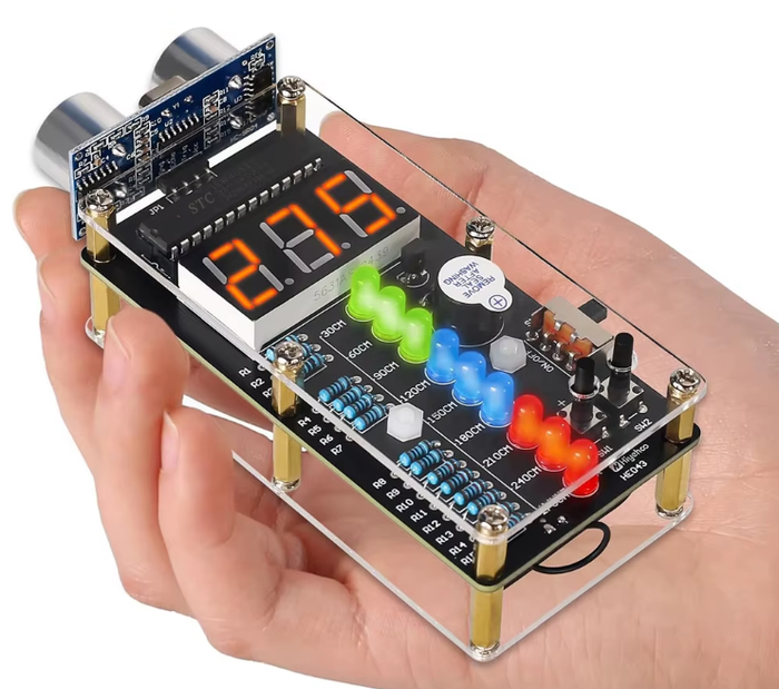 Этот электронный DIY-набор позволяет собрать собственный ультразвуковой измеритель расстояния, основанный на популярном датчике HC-SR04. После пайки и сборки вы получаете не просто модуль для экспериментов, а полноценную систему с цифровым дисплеем, световой индикацией и звуковым сигналом — всё как в настоящих системах парковки и автоматического контроля расстояния.