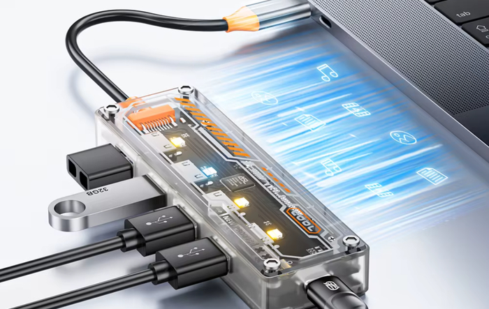 Корпус компактный и легко помещается в карман. Благодаря небольшому весу концентратор удобно носить в чехле с ноутбуком или в рюкзаке. Разъёмы расположены так, чтобы подключённые кабели не мешали друг другу и не перегружали конструкцию. Хаб выдерживает постоянную нагрузку и сохраняет стабильность соединений.