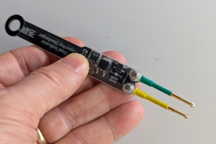 Конструкция инструмента выполнена в форме компактной платы с двумя пружинными щупами, обеспечивающими надежный контакт с разряжаемым элементом. Эргономичный дизайн и удобное крепление позволяют использовать его в любых рабочих условиях, обеспечивая безопасность при работе с опасным напряжением.