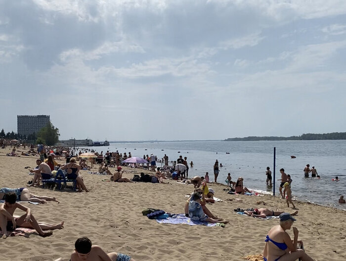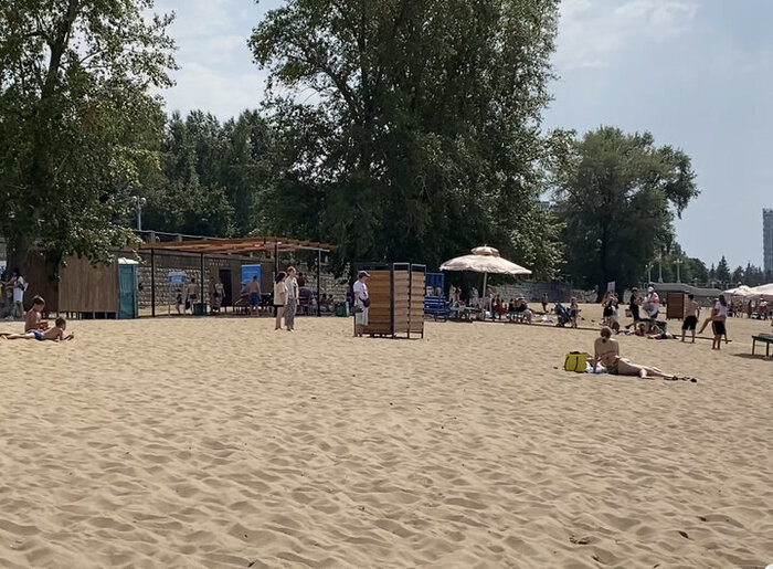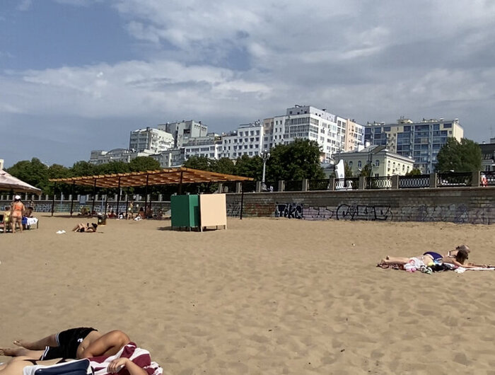 мы прошли немного подальше от речного вокзала, до спуска с улицы Некрасовской. Здесь и песок оказался почище и вход в воду тоже песчаный. Вначале пляжа, где спуск с Ленинградской, при входе в воду попадаются галька и небольшие камни, но почему-то было больше народу.