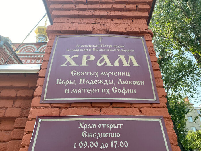 А вот напротив них, пожалуй, самое красивое здание в этом квартале. Да и название тоже соответствующее. Это церковь во имя Святых мучениц Веры, Надежды, Любови и матери их Софии, в простонародье – Николо-Софийская церковь, так как улица Чапаевская до революции была Никольской. А еще ее называли церковью Мариинского детского приюта для девочек-сирот, который находился здесь неподалеку на Саратовской (нынешней улице Фрунзе). Построена церковь была в самом конце XIX века.