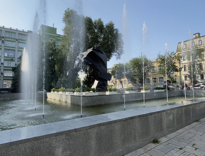 Дальше мы проходим пересекающую улицу Льва Толстого, и как-то быстро доходим до следующего перекрестка с улицей Красноармейской. Возможно, мы что-то и проглядели, пройдя этот квартал, но перед перекрестком мы вышли к фонтану, который, как говорят, был первоначально построен для охлаждения какого-то оборудования, а потом стал очередной городской достопримечательностью. Кроме фонтана, здесь, в небольшом сквере, есть еще одна примечательная трехголовая скульптурная композиция под названием «Борцам за установление Советской власти в Самаре».