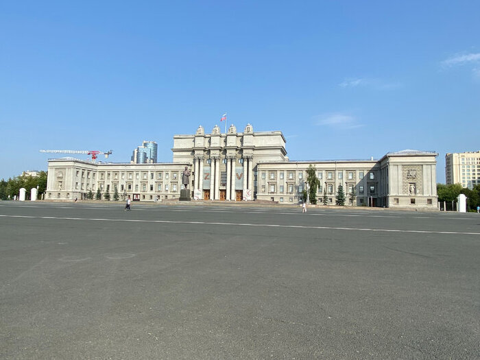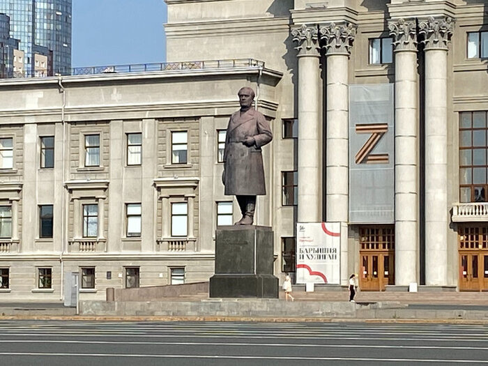 Далее, перейдя перекресток, мы проходим через сквер Памяти Парада 7 ноября 1941 года на площадь имени В.В. Куйбышева. Дело в том, что 7 ноября 1941 года, как и в Москве, здесь был проведен военный парад, а город Куйбышев (тогда так называлась Самара) являлся запасной столицей страны в эвакуации. Ну вот мы и выходим на площадь, где перед массивным зданием театра оперы и балета им. Д.Д. Шостаковича установлен памятник тому самому человеку, чье имя носил этот город много лет – Валериану Владимировичу Куйбышеву.