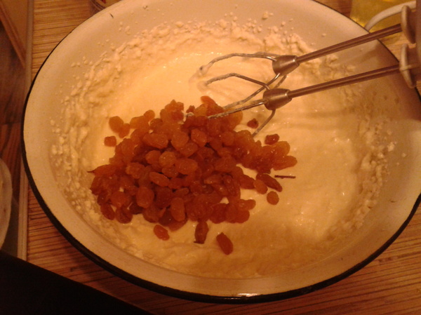 Всё хорошенько перемешиваем (руками, миксером, дрелью (без шуток, пока не купил миксер, смешивал ингредиенты вилкой зажатой в патрон шуруповёрта)). Добавляем промытый изюм.
