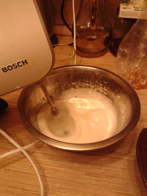 Далее, взбиваем до хорошей пены оставшиеся белки.