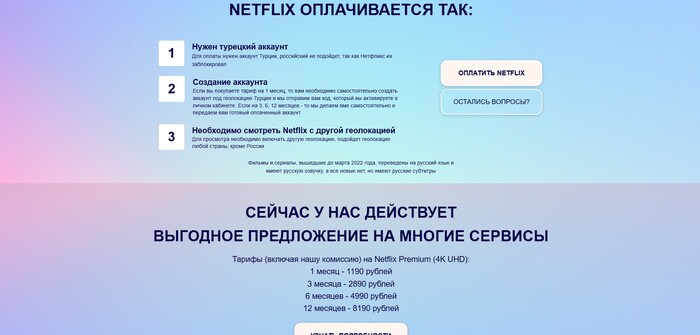 Если вы решите на Netflix купить подписку через посреднический сервис (например, оформляя через подарочные карты или менеджера в Telegram), фактическая сумма может быть немного выше из-за комиссии сервиса. В результате итоговая цена будет складываться из: