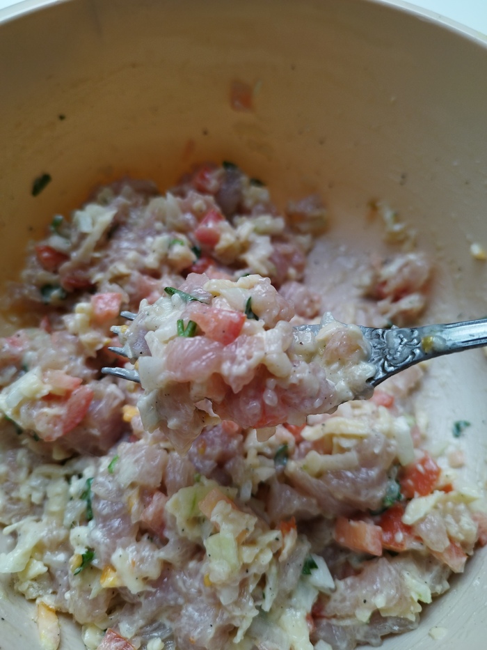 2. Вбиваем 1яйцо, добавляем щепотку соли/ перца, всыпаем муку 3-3,5 столовых ложки и тщательно перемешиваем.