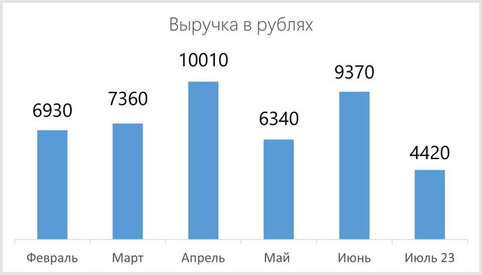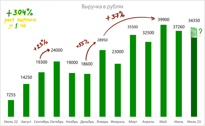 Ниже прикрепляю несколько графиков с показателями основного бота, вот например “Выручка в рублях”, за 1 год рост +304%.
