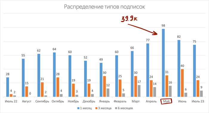 График формирования выручки, на протяжении всего года преобладают месячные подписки, реже 3-месячные и сильно реже на 6 месяцев.