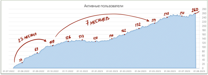 График активных пользователей: 2.5 месяца я шел к первой сотне пользователей, вторая сотня появилась спустя еще 7 месяцев.