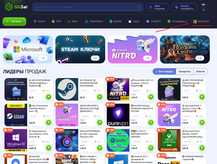 1. Переходим на страницу ggsel.net и выбираем раздел Microsoft.