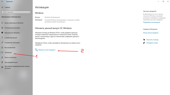 3. Далее выбрать раздел "Активация" и перейти к пункту "Изменить ключ продукта".